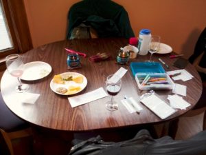 a table with snacks and slips of paper